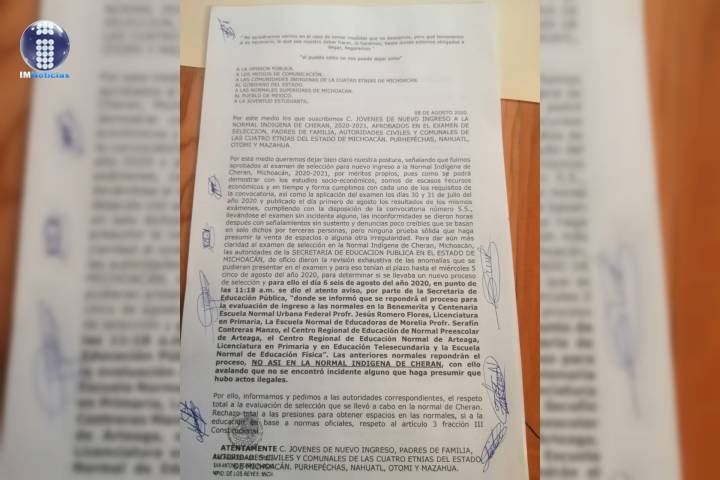 NOTICIAS 08/08/2020Padres de Cherán defienden a los que pasaron exámenes en Normales.Comuneros de Cherán se han acercado a la redacción de IMNoticias para dar a conocer lo que consideran se puede convertir en una injusticia en caso de que se repita el examen de ingreso a la Escuela Normal Rural de Cherán.