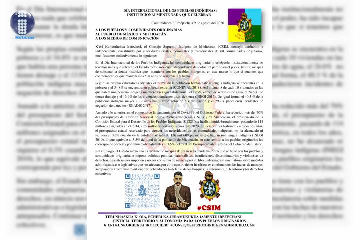 NOTICIAS 09/08/2020Día de los pueblos indígenas, institucionalmente nada que celebrarEl Consejo Supremo Indígena de Michoacán #CSIM, consejo que aglutina autoridades de 60 comunidades originarias manifestó que en el "Día Internacional de los Pueblos Indígenas", las comunidades p´urhépecha institucionalmente no tienen nada que celebrar, porque el Estado mexicano ha sido incapaz de subsanar la deuda histórica que mantiene con los pueblos indígenas, por lo que lo único que tienen que conmemorar, es que mantienen 528 añ... Ver más...