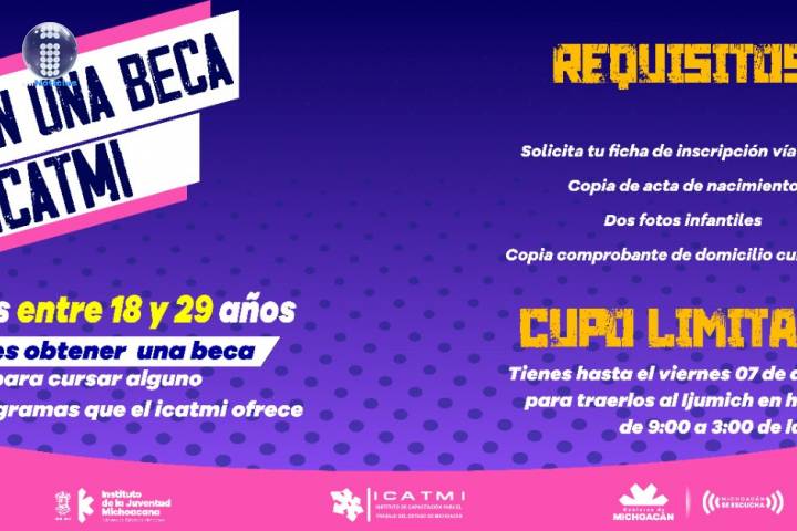 NOTICIAS 06/08/2020Otorgará Ijumich becas para el Icatmi del 100%, en el marco del Mes de la JuventudComo parte de los festejos que el Instituto de la Juventud Michoacana (Ijumich) organiza para celebrar el Mes de la Juventud, se otorgarán a los jóvenes de entre 18 y 29 años una beca del 100 por ciento para los cursos que ofrece el Instituto de Capacitación para el Trabajo en Michoacán (ICATMI), con cupo limitado.