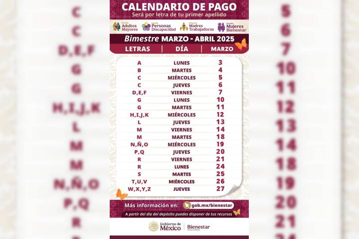 NOTICIAS 03/03/2025En marzo, pago de Pensiones y Programas para el Bienestar: Ariadna MontielDurante la conferencia matutina: "Las mañaneras del pueblo", que encabeza la Presidenta Claudia Sheinbaum Pardo en Palacio Nacional, la secretaria de Bienestar, Ariadna Montiel Reyes, informó que del 3 al 27 de marzo se realiza la dispersión del pago de las Pensiones y Programas para el Bienestar correspondiente al bimestre marzo-abril a 15.2 millones de derechohabientes adultos mayores, mujeres bienestar, personas con discapacidad y madres tr... Ver más...
