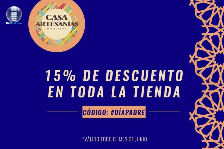 NOTICIAS 10/06/2020Festejará IAM a los papás con descuentos en su tienda en lÃnea Con el objetivo de festejar a los papás en su dÃa, durante todo este mes de junio la tienda en lÃnea del Instituto del Artesano Michoacano (IAM), "artesanÃas-michoacan.com", tendrá el 15 por ciento de descuento en todos los departamentos, refirió la directora general del IAM, MarÃa Emilia Reyes Oseguera.