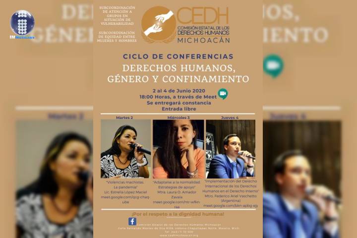 NOTICIAS 01/06/2020Ofrece CEDH ciclo de conferencias virtual Derechos Humanos, Género y ConfinamientoCon la finalidad de continuar la capacitación y divulgación en lÃnea, la Comisión Estatal de los Derechos Humanos (CEDH) ofrece el Ciclo de Conferencias virtual Derechos Humanos, Género y Confinamiento, dirigido a todo público.