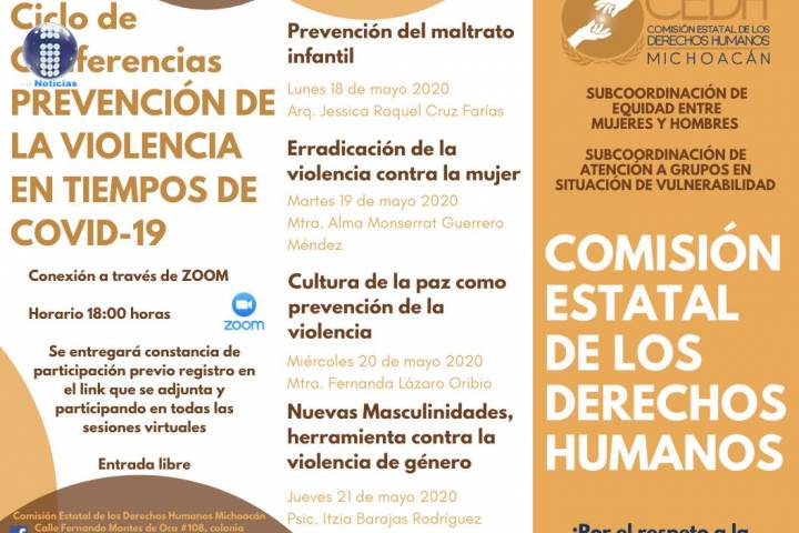 NOTICIAS 18/05/2020Ofrece CEDH ciclo de conferencias virtuales sobre prevención de la violencia A partir de este lunes 18 y hasta el jueves 21 de mayo la Comisión Estatal de los Derechos Humanos (CEDH) ofrecerá el Ciclo de Conferencias virtuales Prevención de la Violencia en Tiempos de Covid-19.