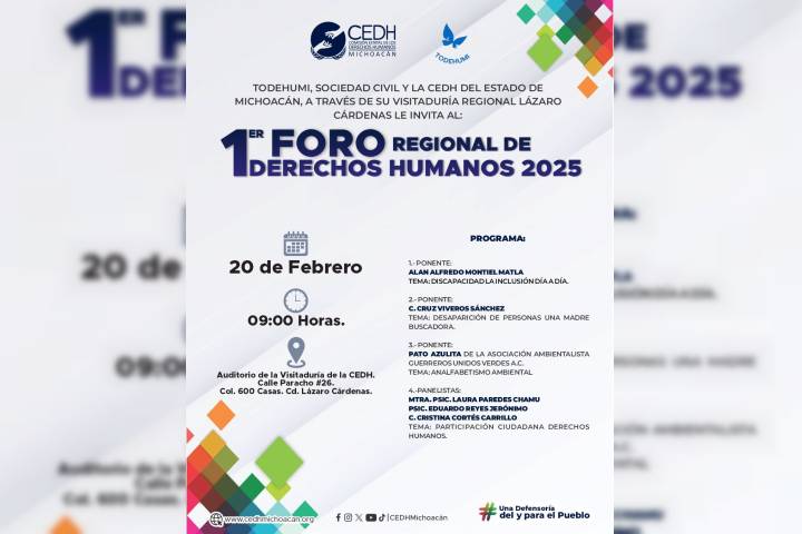 NOTICIAS 18/02/2025Primer Foro Regional de Derechos Humanos en Lázaro CárdenasLa Comisión Estatal de los Derechos Humanos y el colectivo Todehumi, realizarán el Primer Foro Regional de Derechos Humanos el próximo jueves 20 de febrero, en Lázaro Cárdenas, Michoacán, en el cual se espera contar con gran participación ciudadana.