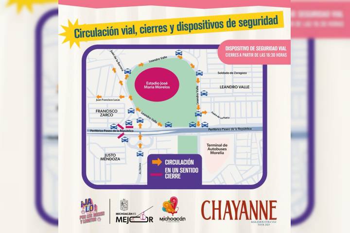 NOTICIAS 20/02/2025¡Toma precauciones! Habrá cierres vehiculares por concierto de Chayanne en el MorelosEl Gobierno de Michoacán informó que a través del Agrupamiento de Seguridad Vial se implementará un operativo en las inmediaciones del Estadio Morelos por el concierto gratuito de Chayanne, como parte del Festival Jalo por los Michis y Lomitos.