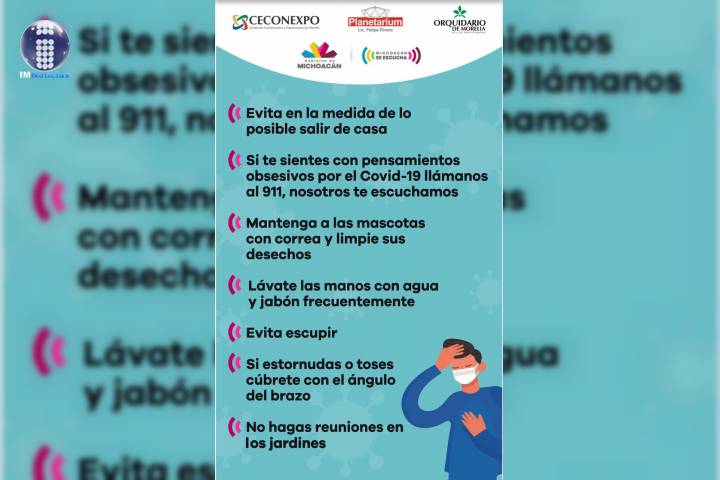 NOTICIAS 27/03/2020Extremar precauciones, pide CECONEXPO a visitantes Ante la contingencia por el COVID-19, el Centro de Convenciones y Exposiciones de Morelia pidió a todas las personas que por algún motivo aún asisten al recinto, lo hagan de manera responsable y con las medidas sanitarias adecuadas.