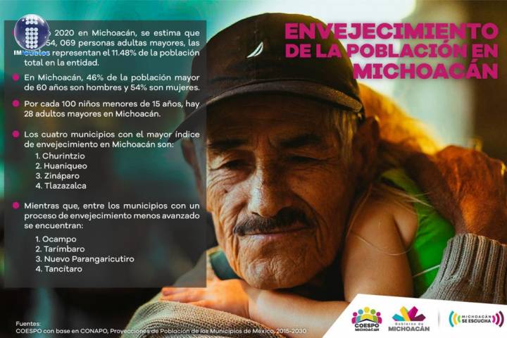 NOTICIAS 27/02/2020Michoacán a tiempo de atender el envejecimiento de la población: CoespoSe estima que al año 2020 en Michoacán 554 mil 069 personas son adultos mayores de 60 años, las cuales representan el 11.48 por ciento de la población total en la entidad, esto de acuerdo con información proporcionada por la Secretaría de Gobierno a través del Consejo Estatal de Población (Coespo).