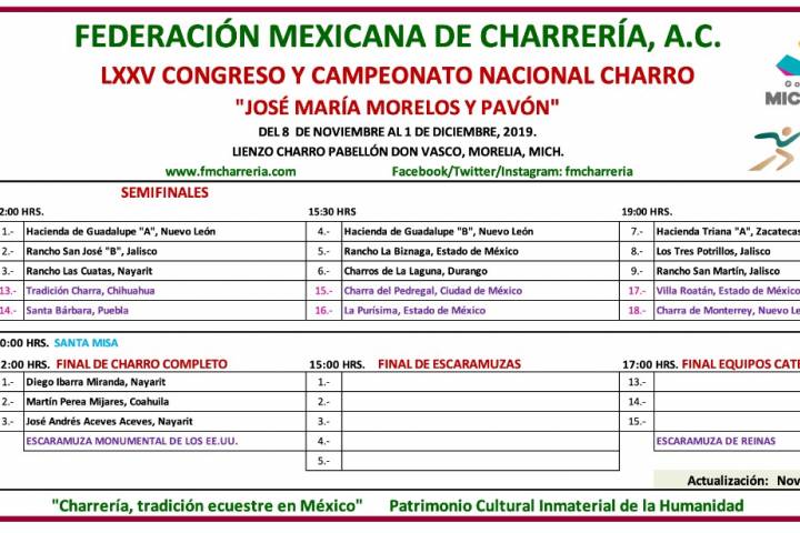 NOTICIAS 30/11/2019Llegan semifinales del Campeonato Nacional Charro al Pabellón Don VascoEl Congreso y Campeonato Nacional Charro "José María Morelos y Pavón" 2019 está por llegar a su fin y es que este sábado se vivirá la jornada número 22 con las semifinales, donde los nueve mejores equipos de charros del país y de Estados Unidos demostrarán en el ruedo de qué están hechos para coronarse campeones.