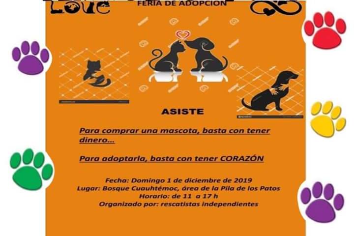 NOTICIAS 30/11/2019Adopción en la Fuente de "Los patos"Este domingo uno de diciembre, rescatistas independientes realizarán una feria de adopción canina en la Fuente de los Patos, ubicada en el Bosque Cuauhtémoc, de las once a las 17 horas. A un callejerito dale, esta Navidad, amor y un hogar, adóptalo.