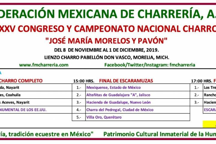 NOTICIAS 30/11/2019Afición charra, presente en las finales del Campeonato Nacional A unas horas de la gran final del 75 Congreso y Campeonato Nacional Charro "José María Morelos y Pavón" 2019, la afición a la Charrería ya tiene a sus favoritos para esta última etapa.