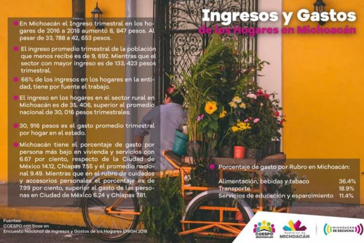 NOTICIAS 23/09/2019Presenta Coespo análisis sobre ingreso en hogares michoacanos Con base en la Encuesta Nacional de Ingresos y Gastos en los Hogares 2018, presentada el pasado 30 de julio por el Instituto Nacional de Estadística y Geografía (INEGI), la Secretaría de Gobierno a través del Consejo Estatal de Población (Coespo), como parte de sus atribuciones relacionadas con la recopilación, clasificación y análisis de información sociodemográfica en la entidad, para la toma de decisiones y la generación de estudio... Ver más...