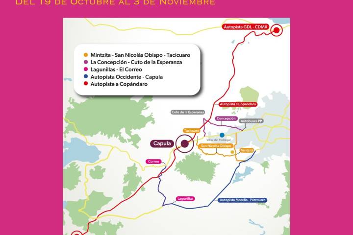 NOTICIAS 15/10/2024Conoce las rutas alternas para llegar a Capula a la Feria de la CatrinaLa Secretaría de Comunicaciones y Obras Públicas (SCOP) da a conocer a turistas y visitantes las rutas alternas para llegar a la tenencia de Capula, donde, del 20 de octubre al 3 de noviembre, se desarrollará la 14 Feria Nacional y Cultural de la Catrina.