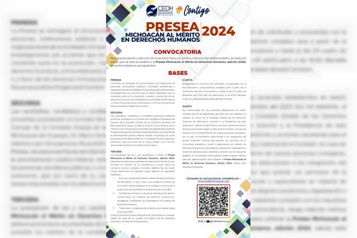 NOTICIAS 22/10/2024Convoca CEDH a postular a personas candidatas a recibir la Presea Michoacán al Mérito en Derechos Humanos
