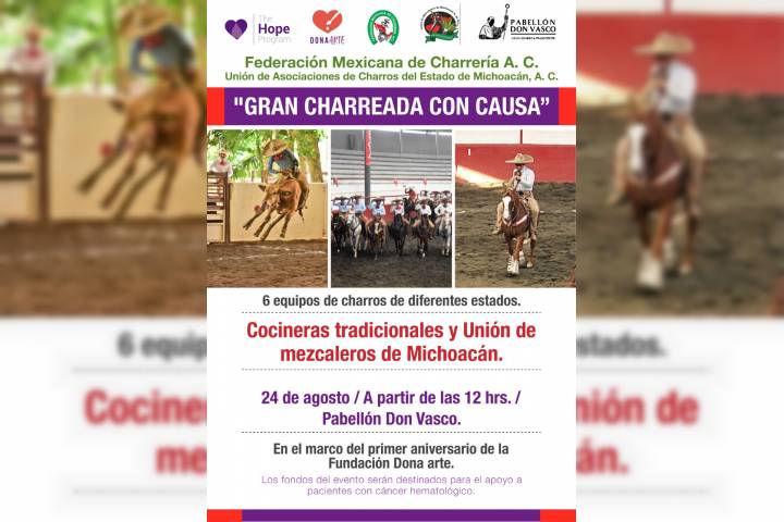 NOTICIAS 09/08/2019Realizarán Charreada en beneficio de pacientes con cáncer hematológico En el marco del primer aniversario de la Fundación Donarte, la Unión de Asociaciones de Charros del Estado de Michoacán llevará a cabo la "Charreada con Causa" el próximo 24 de agosto del presente año, a las 12 horas, en el Pabellón Don Vasco de Morelia.