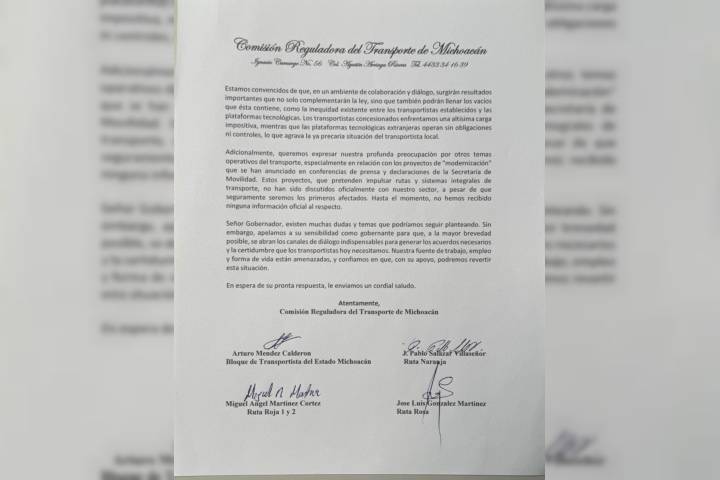 Los transportistas agrupados en la Comisión Reguladora del Transporte de Michoacán nos dirigimos a usted, una vez más, con el propósito de solicitar su atención y un diálogo directo con nuestro sector. Durante estos tres años de su administración, lamentablemente, no hemos contado con el espacio necesario para abordar los problemas más urgent... Ver más...