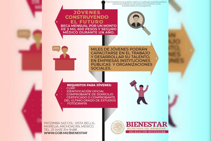 NOTICIAS 27/03/2019Invita Icatmi a registrarse a la Beca "Jóvenes Construyendo el Futuro"; el registro concluye el 30 de marzoSi tienes entre 18 y 29 años de edad, no estás estudiando ni laborando, en el Instituto de Capacitación para el Trabajo del Estado de Michoacán, puedes acceder a la Beca "Jóvenes Construyendo el Futuro", cursando la especialidad de Asistente Contable. Esta beca otorga tres mil 600 pesos al mes, por un periodo de un año.