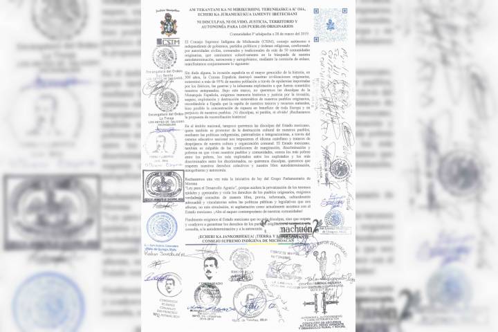 El Consejo Supremo IndÃgena de Michoacán (CSIM), consejo conformado por autoridades civiles, comunales y tradicionales de más de 50 comunidades p´urhépechas, mediante un manifiesto rechazaron la solicitud de disculpas emitida por el Gobierno de México al Gobierno de España, calificando la conquista de México como "el mayor genocidio de la historia", exigiendo memoria histórica y justicia por la invasión, saqueo y destrucción sistemá... Ver más...