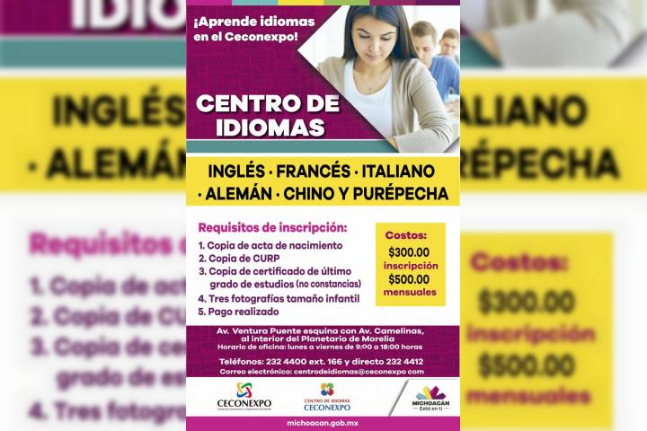 Al respecto, el director general del CECONEXPO, Oscar Celis Silva, informó que los seis idiomas que se ofertarán al público, son: Inglés, francés, italiano, alemán, chino y purépecha.