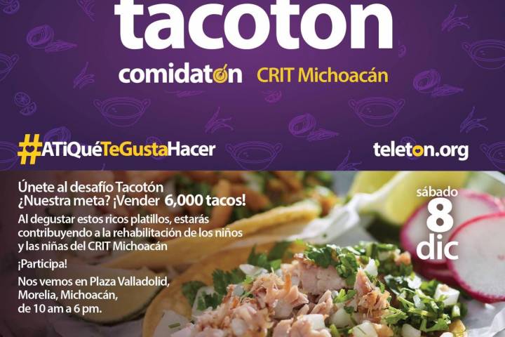 NOTICIAS 07/12/2018Tacotón, mañana en MoreliaEl próximo 08 de diciembre, el Centro de Rehabilitación e Inclusión Infantil Teletón (CRIT) Michoacán realizará el evento denominado "Tacotón", con la finalidad de recaudar donaciones para el tratamiento de los más de 600 niños y niñas con discapacidad que atienden.