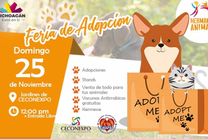 NOTICIAS 21/11/2018Próximo domingo, Feria de Adopción Hermano Animal La asociación civil Hermano Animal, invita a todas y todos los michoacanos a la Feria de Adopción de mascotas que realizará este domingo 25 de noviembre en los jardines del Centro de Convenciones y Exposiciones de Morelia (Ceconexpo), de las 12:00 a las 17:00 horas.