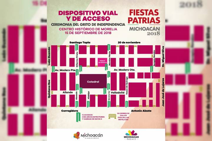 NOTICIAS 13/09/2018Conoce la ubicación de los arcos de acceso para disfrutar los Festejos Patrios Bajo la premisa de que michoacanas y michoacanos disfruten a plenitud los eventos realizados en el marco del 208 aniversario del inicio de la Independencia de México, se instalarán arcos de acceso para la gente que acuda al Centro Histórico, a fin de salvaguardar a la ciudadanía.