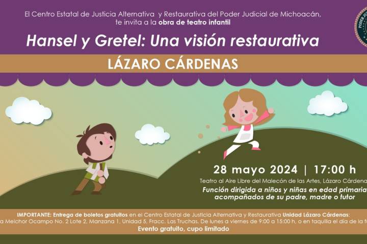 NOTICIAS 16/05/2024Niñas y niños de Lázaro Cárdenas podrán disfrutar de la obra de teatro infantil Hansel y Gretel, una visión restaurativaInició la entrega de boletos gratuitos para que niñas y niños de Lázaro Cárdenas disfruten de la obra de teatro infantil Hansel y Gretel, una visión restaurativa, adaptada por el Poder Judicial de Michoacán y que se presentará el próximo martes 28 de mayo a las 17:00 horas en el Teatro al Aire Libre del Malecón de las Artes.