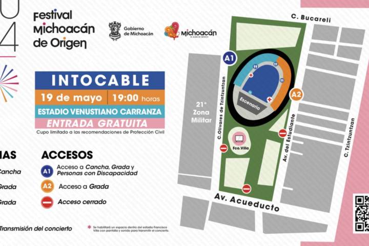NOTICIAS 18/05/2024Conoce los accesos en el Venustiano para el concierto de Intocable El Festival Michoacán de Origen (FMO) cierra su edición 2024 con el concierto de Intocable, que se presenta mañana domingo 19 de mayo en el Estadio Venustiano Carranza de la Unidad Deportiva Ejército de la Revolución.