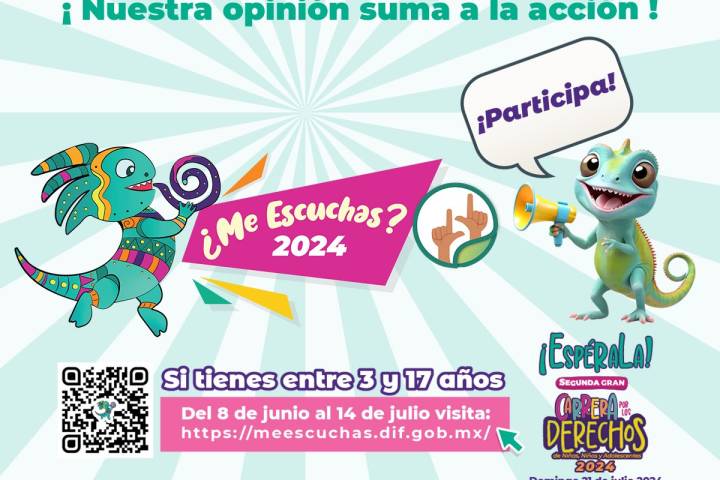 NOTICIAS 24/05/2024DIF Michoacán invita a niñas, niños y adolescentes a participar en consulta nacionalLa consulta nacional de niñas, niños y adolescentes ¿Me Escuchas? 2024 del DIF se realizará del 8 de junio al 14 de julio, con el objetivo de que este sector de la población exprese y dé a conocer sus intereses en temas de salud, educación, deportes, cultura, medio ambiente, alimentación y otros.