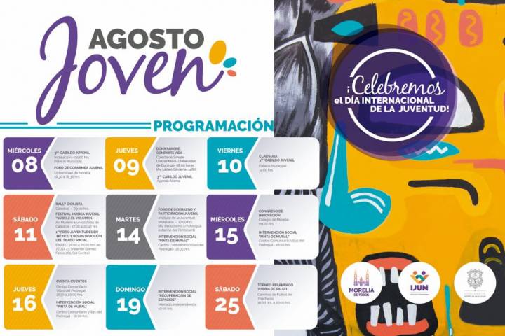 NOTICIAS 16/08/2018Continúan en Morelia actividades de "Agosto Joven" del IJUM En el ánimo de reconocer a este sector de la población e impulsar acciones para su desarrollo y participación, el Instituto de la Juventud Moreliana (IJUM) continúa con las actividades correspondientes al "Agosto Joven", las cuales están encaminadas a la convivencia y el apoyo social en favor de la comunidad.