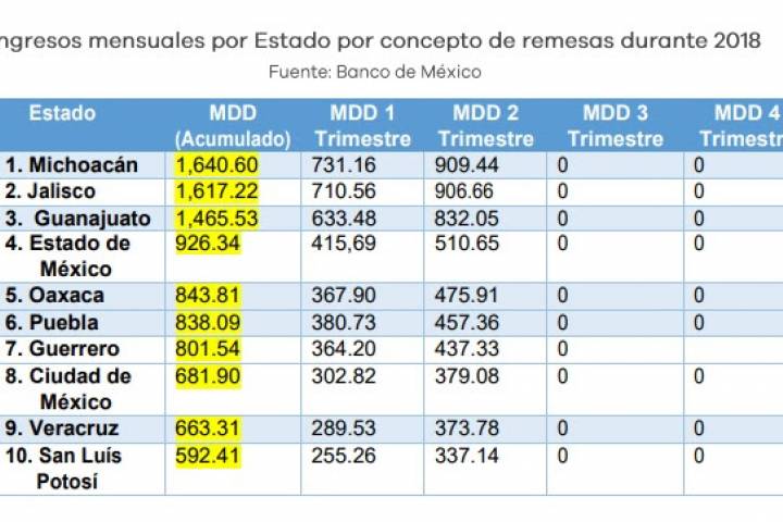 NOTICIAS 05/08/2018Con 1,640 mdd, Michoacán, primer receptor de remesas en MéxicoMichoacán se consolidó como la entidad mexicana con la mayor percepción de remesas al cierre del mes de junio del presente año, tras ingresar recursos por el orden de los mil 640 millones de dólares, es decir, un 11 por ciento más que lo captado al mismo periodo del año pasado.
