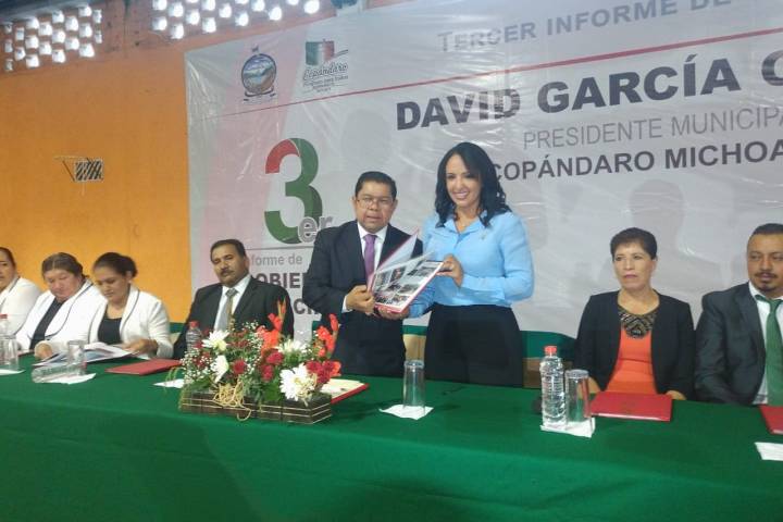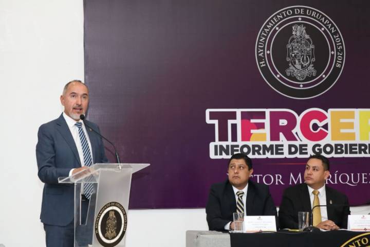 Con la representación del gobernador de Michoacán, Silvano Aureoles Conejo, el titular de la Secretaría de Comunicaciones y Obras Públicas (SCOP), José Juan Domínguez López, presenció el tercer informe de gobierno del presidente municipal de Uruapan, Víctor Manuel Manríquez González.