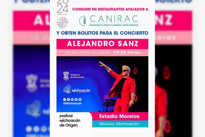NOTICIAS 07/05/2024Conoce los restaurantes que te llevan al concierto de Alejandro Sanz en el Festival de Origen Los negocios afiliados a la Cámara Nacional de la Industria de Restaurantes y Alimentos Condimentados (Canirac) también te llevan al concierto de Alejandro Sanz, como parte del Festival Michoacán de Origen.