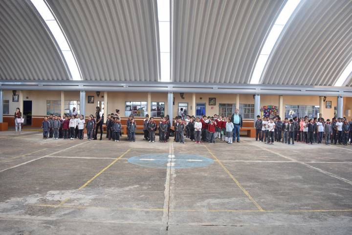 NOTICIAS 21/05/2018Estudiantes de Primaria de Tacícuaro estrenan techumbre de su patio cívico Las y los estudiantes de la Escuela Primaria "Santos Degollado", en la tenencia moreliana de Tacícuaro, estrenaron hoy la techumbre de su patio cívico.