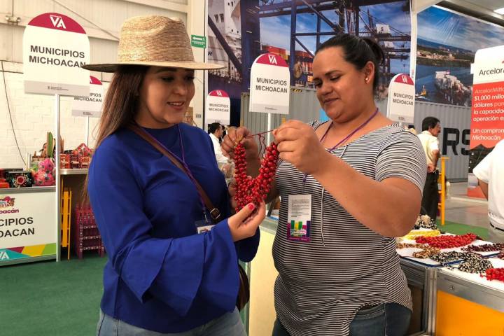 Artesanas, artesanos, productoras y productores michoacanos ofrecen una gran variedad de productos de calidad y promocionan las regiones turísticas del estado en la Expo Fiesta Michoacán 2018.