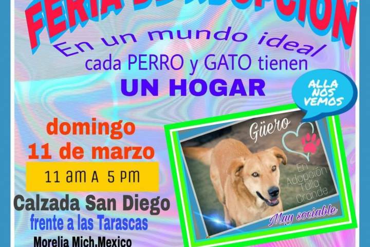 NOTICIAS 10/03/2018En San Diego, este domingo, segunda Feria de Adopción Canina del añoEn la entrada a la Calzada Fray Antonio de San Miguel, popularmente conocida como de San Diego, justo frente a Las Tarascas, este domingo se llevará a cabo, de las 11 a las 17 horas, la Segunda Feria de Adopción Canina y Felina del 2018, organizada por animalistas independientes y grupos como Miis Peek, Lors Perruna y Ponterosso.
