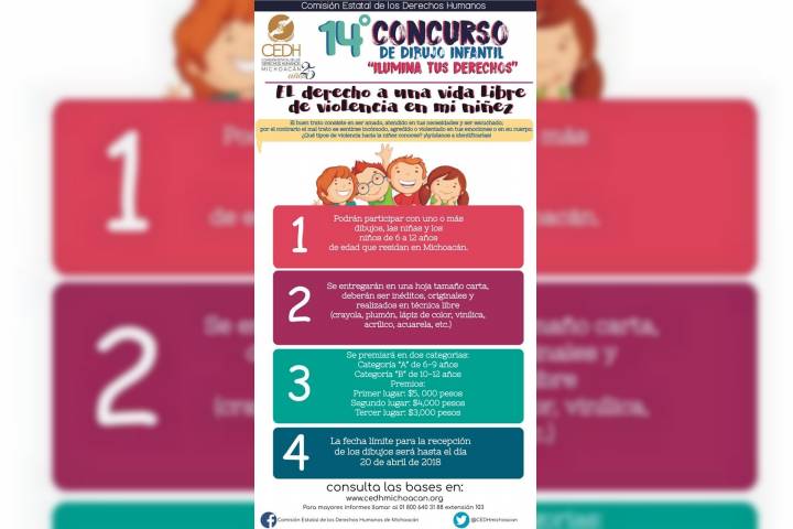 NOTICIAS 06/03/2018Abre CEDH convocatoria de Concurso de Dibujo Infantil Con el tema "El derecho a una vida libre de violencia en mi niñez", la Comisión Estatal de los Derechos Humanos (CEDH) abrió la convocatoria del 14° Concurso de Dibujo Infantil "Ilumina tus derechos".