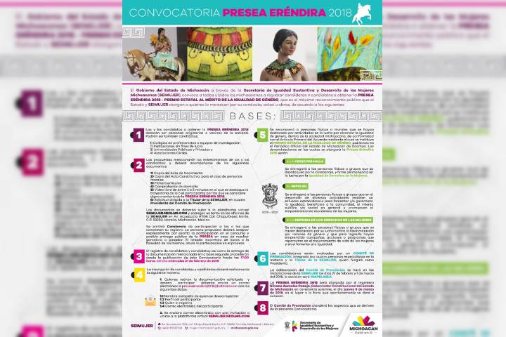 NOTICIAS 12/02/2018Lanza Gobierno del Estado convocatoria a la Presea Eréndira 2018Para reconocer a las y los ciudadanos u organizaciones que hayan destacado por sus actividades dirigidas alcanzar la igualdad entre mujeres y hombres en Michoacán, Gobierno del Estado, a través de la Secretaría de Igualdad Sustantiva y Desarrollo de las Mujeres (Seimujer), lanza la convocatoria para la Presea Eréndira 2018.