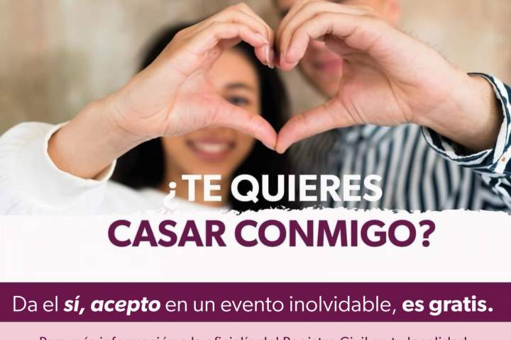 NOTICIAS 07/02/2024Habrá bodas gratis el 14 de febrero en MichoacánLa Secretaría de Gobierno, a través de la Dirección del Registro Civil, celebrará el 14 de febrero la segunda edición de la campaña ¿Te quieres casar conmigo?, para ofrecer a las parejas la oportunidad de unirse en matrimonio de manera gratuita.