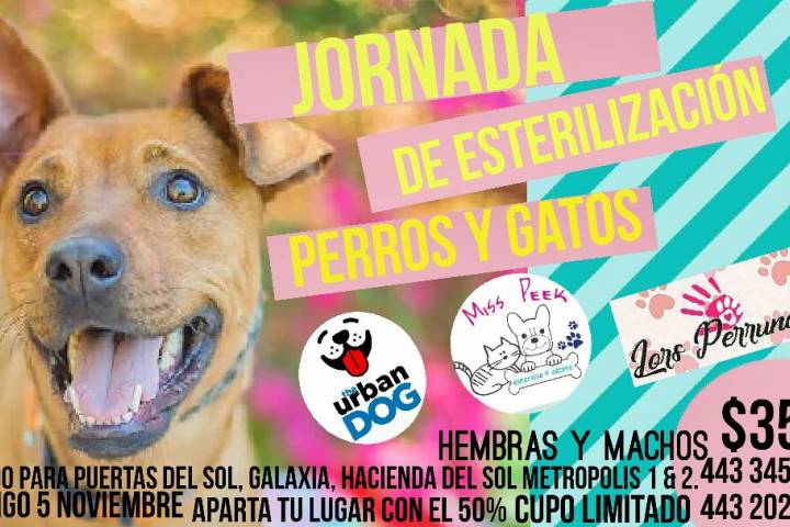 NOTICIAS 03/11/2017Jornada de esterilización de perros y gatos el domingo 5 de noviembreAnte la proliferación de perros y gatos en condición de calle, asociaciones animalistas llevarán a cabo, el domingo 5 de noviembre, una jornada de esterilización dirigida, principalmente, a las colonias Puertas del Sol, Galaxia, Hacienda del Sol y Metrópolis, con una cuota de recuperación inferior en más del 200 por ciento a lo que normalmente cobran por esa cirugía en las clínicas veterinarias.
