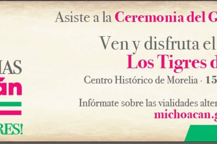 NOTICIAS 12/09/2017La noche del Grito, concierto gratuito de Los Tigres del Norte El Gobierno de Estado, que encabeza el Gobernador Silvano Aureoles Conejo, invita a las y los michoacanos a hacer suyos los espacios públicos y a disfrutar las Fiestas Patrias.