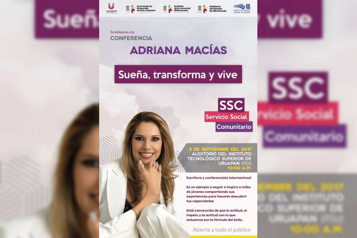 NOTICIAS 01/09/2017Fomentan la participación ciudadana, la prevención y el desarrollo de los jóvenes Con los objetivos de fomentar la participación ciudadana, prevenir actividades de riesgo y motivar a las y los jóvenes a implementar actividades de desarrollo comunitario, la Secretaria de Desarrollo Social y Humano (Sedesoh), el Instituto de la Juventud Michoacana (Ijumich), el Ayuntamiento de Uruapan y el Instituto Tecnológico Superior de Uruapan (ITSU), invitan a la conferencia de la escritora y motivadora internacional Adriana Macías.