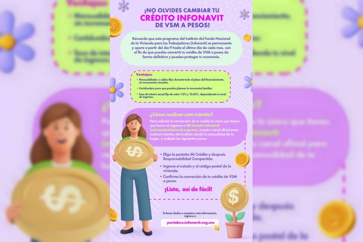NOTICIAS 05/12/2023Se acaba el tiempo para convertir tu crédito Infonavit a pesosSi tienes un Crédito Infonavit y está denominado en Veces Salario MÃnimo (VSM), el saldo