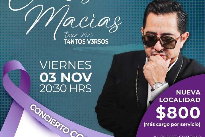 NOTICIAS 29/10/2023Boletos desde 800 pesos en el concierto de Carlos MacíasEl cantautor mexicano Carlos Macías nos reitera la invitación al Concierto con causa que brindará en Morelia el próximo viernes 3 de noviembre en el Teatro Mariano Matamoros en Morelia, a beneficio de la Fundación Dona Arte para ayudar a personas con cáncer. El artista espera apoyar así a la venta total del boletaje.