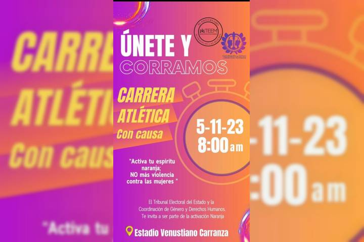 NOTICIAS 30/10/2023TEEM Conmemora Día Naranja con Carrera Atlética.El Tribunal Electoral del Estado (TEEM) a través de la Coordinación de Género y Derechos Humanos, te invita a la Carrera Atlética con causa 2023, por la Erradicación de la violencia contra las mujeres #ActivTúEspírituNaranja. La cita será el próximo domingo 05 de noviembre, en el Venustiano Carranza a las 8:00 am.