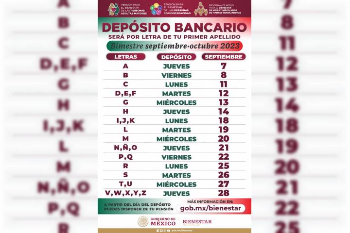 NOTICIAS 05/09/2023Inicia Secretaría de Bienestar pago de pensiones y programas del bimestre septiembre-octubre La secretaria de Bienestar, Ariadna Montiel Reyes, informó que, a partir del 7 septiembre, inicia la dispersión de recursos a derechohabientes y beneficiarios de la Pensión para el Bienestar de las Personas Adultas Mayores, Pensión para el Bienestar de las Personas con Discapacidad, y Programa de Apoyo para el Bienestar de Niñas y Niños, Hijos de Madres Trabajadoras en todo el país a través de la tarjeta del Banco del Bienestar.