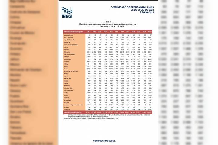 NOTICIAS 25/07/2023En 2022 Gobierno de Michoacán rompe inercia en aumento en homicidios: InegiDurante 2022, el Gobierno de Michoacán rompió la inercia de homicidios que venía a la alza en los últimos 10 años, de acuerdo con datos del Inegi.