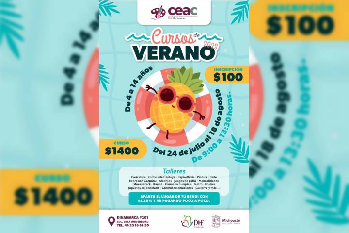 NOTICIAS 17/07/2023Ofrece DIF Michoacan diez cursos de verano El Centro de Educación ArtÃstica y Cultural (CEAC) José Ma. Morelos, del Sistema DIF Michoacán, realizará los cursos de verano de expresión corporal, muralismo y pintura, caricatura, alebrijes, globos de cantoya, papiroflexia, karate, baile, manualidades, juego de pelota, iniciación musical, gimnasia olÃmpica, entre otros, informó el director general, Óscar Celis Silva.