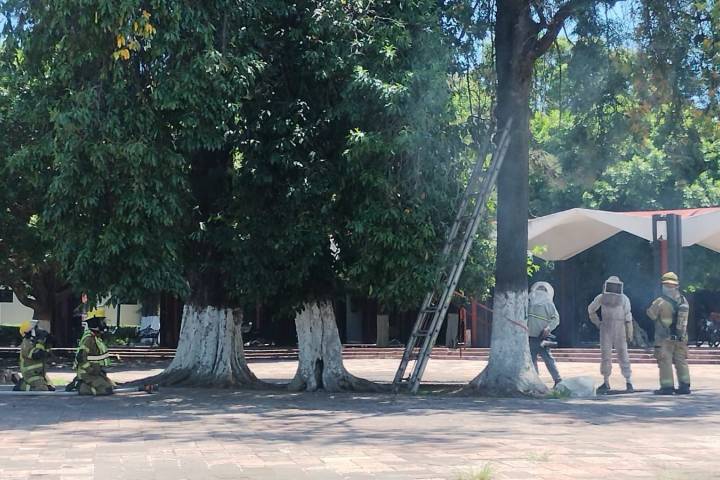 Poco después de las 10:00 horas, elementos de Protección Civil estatal m, en coordinación con instancias municipales atendieron el reporte de la presencia de un enjambre de abejas en la explanada Miguel Hidalgo.