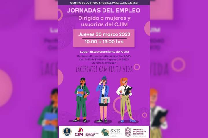 NOTICIAS 29/03/2023Con apoyo de CONAVIM y SNE, CJIM realizará jornada de empleo en MoreliaComo parte de las acciones para ayudar a que las mujeres que han sido víctimas de violencia, logren un desarrollo integral en sus vidas, a través del empoderamiento económico, la Fiscalía General del Estado de Michoacán (FGE) llevará a cabo una jornada de empleo dirigida a usuarias del Centro de Justicia Integral para las Mujeres (CJIM) Morelia.