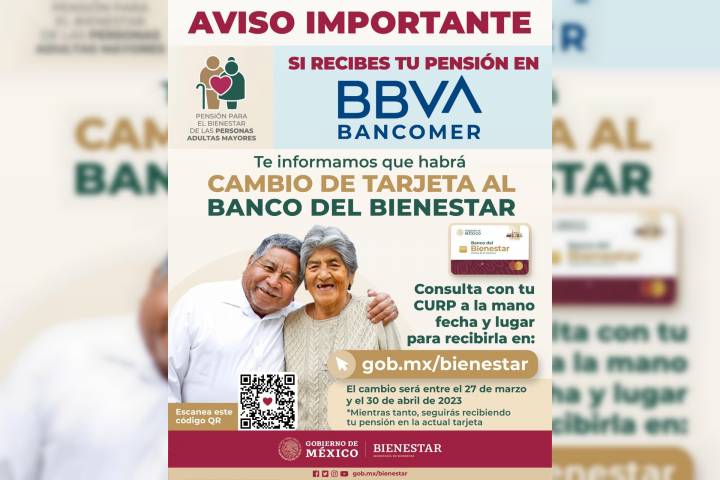 NOTICIAS 27/03/2023Inicia entrega de Tarjetas para el Bienestar a personas adultas mayores que cobran con tarjeta BBVA BancomerLa secretaria de Bienestar, Ariadna Montiel Reyes, informó que a partir de hoy y hasta el 30 de abril, las personas adultas mayores que cobran aún con tarjeta BBVA Bancomer deberán recibir su tarjeta del Banco del Bienestar para continuar recibiendo este derecho constitucional.